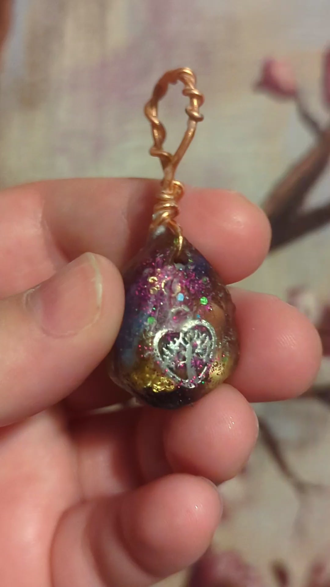 The metal components in the pendant are 24k gold plated beads and copper chips