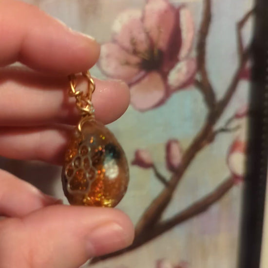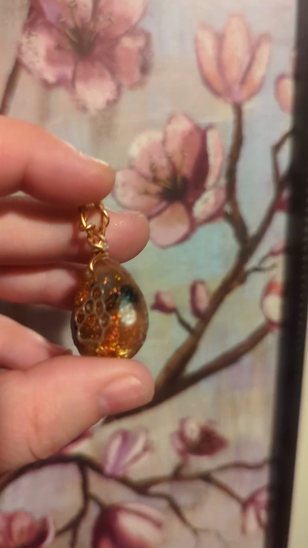 The metal components in the pendant are 24k gold plated beads and copper chips