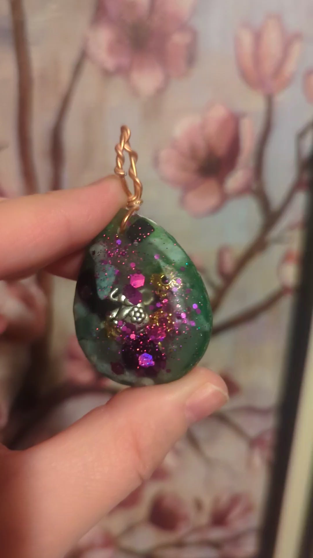 The metal components of this pendant are 24k Gold plated beads and Copper Chips