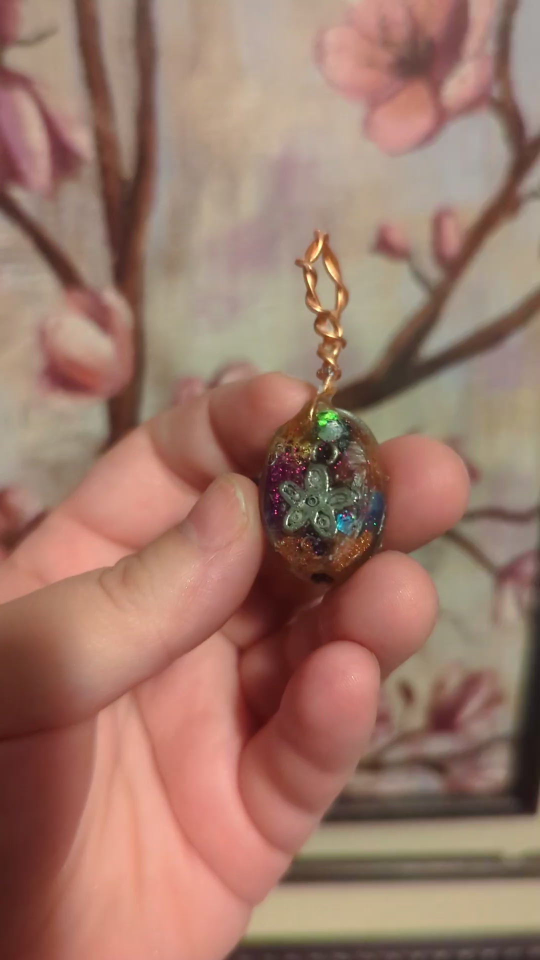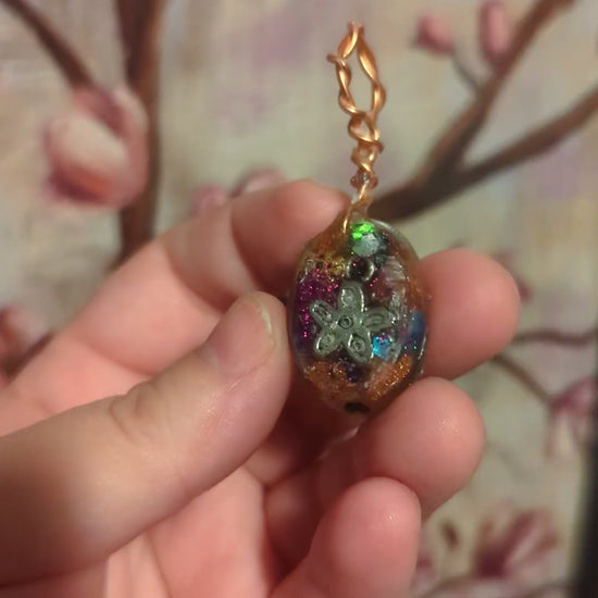 The metal components in the pendant are 24k gold plated beads and copper chips