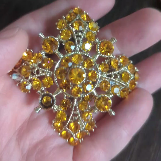 Orange Rhinestones, Vintage Brooch. Lovely Vintage Pin with Orange Rhinestones. One appears to be missing and another I had to glue back into place. Despite that it is still wearable and quite pretty. The way the light dances across the Rhinestones is beautiful. It may be seen as a Flower or as a Cross. Orange Flowers stand for Enthusium, Desire, and Fascination. A Cross can stand for salvation and sacrifice, Memory of those who have passed on, Victory over Death, and Divine and Earthly Connection. Both stand for Hope