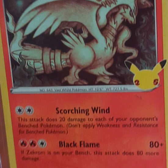 Reshiram, 002/025. 2021. 130hp. Scorching Wind. Black Flame. "When Reshiram 's tail flares, the heat energy moves the atmosphere and changes the world's weather."